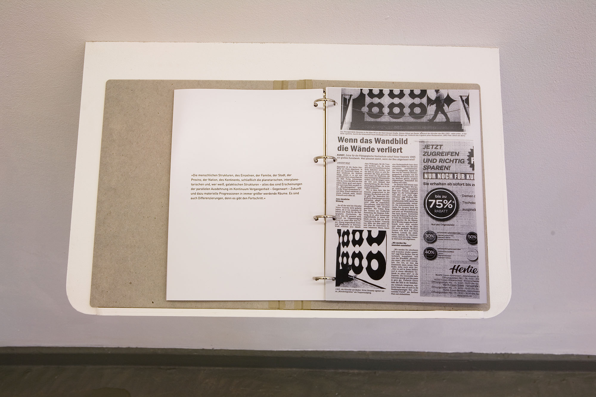 Victor Vasarely’s intégration architecturale was conceived and realised as art in architecture (Kunst am Bau) for a specific site in a university building (Pädagogische Hochschule) in Essen. The building was abandoned in the 2000s and was given up in 2011. Eventually, it was demolished to make space for real estate development. While the building was sacrificed, the artwork was evacuated and restored as it had been overpainted with graffiti.