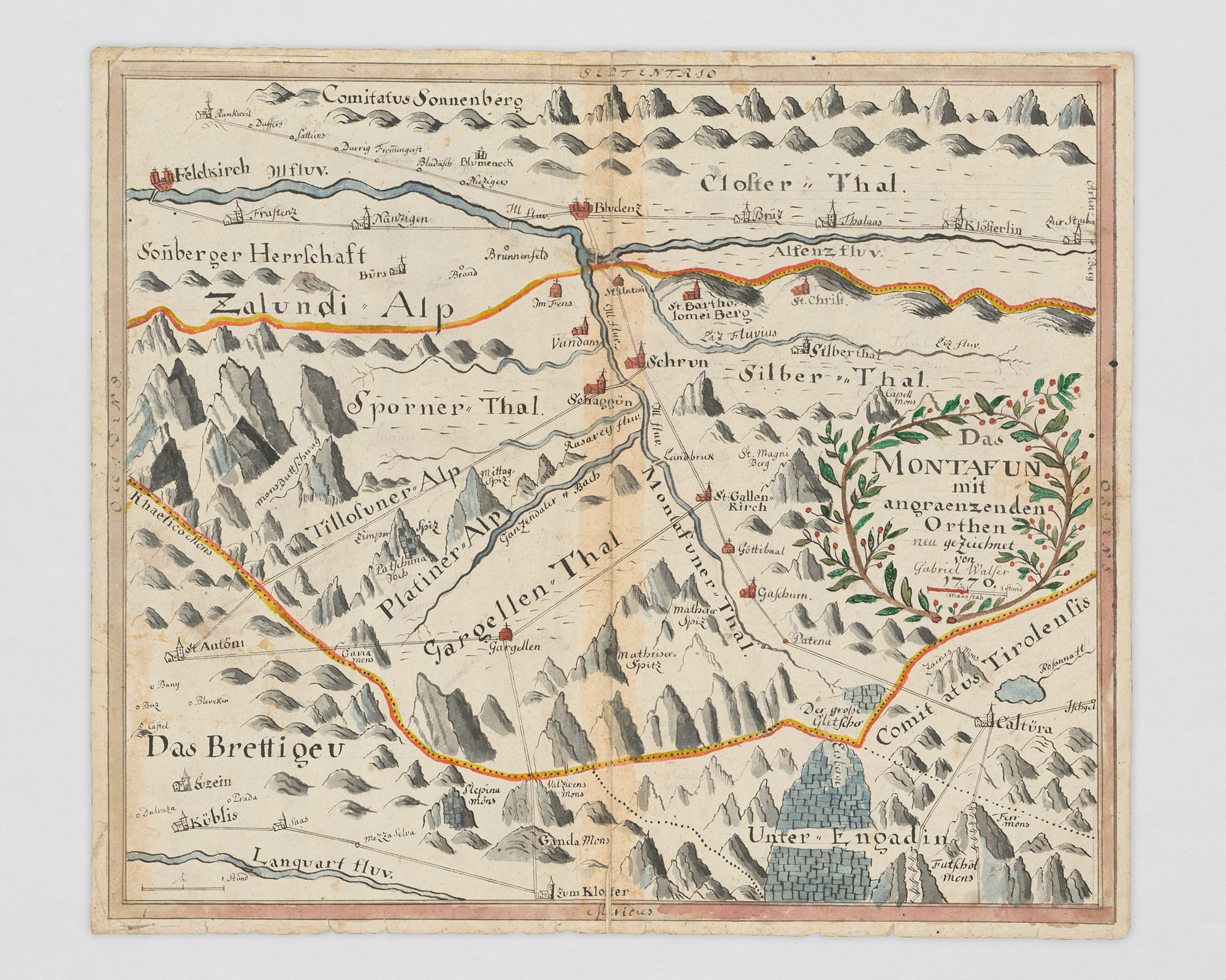 A selection of historical manuscripts, maps, and visual representations aims to trace how natural climate change and the related extension of glaciers affected communities during the Little Ice Age. Among the first documents mentioning the glaciers are court files concerned with conflicts between villages from Tyrol and Graubünden that were obstructed in their traditional use of mountain passes and agricultural land, which increased concurrence.